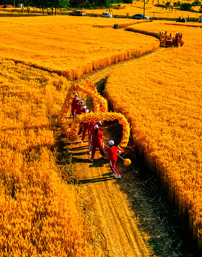 面对统筹疫情防控和粮食流通改革发展的繁重任务,国家粮食和物资储备局全力抓好今年夏粮收购工作。图为江苏省宿迁市双沟镇民间艺人通过舞龙等方式喜庆小麦丰收。