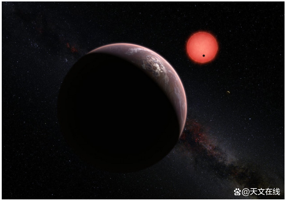 然而,鉴于它的恒星的大小,为了保持一直在宜居带,TRAPPIST-1e必须在离恒星很近的距离围绕它旋转,因此它很有可能会被潮汐锁定。这意味着,这颗行星会像月亮一样,始终有一面朝向它的恒星。因此,它面对恒星的那一面将会很热,而另一半球则会永远沐浴在永恒的黑夜之中。当然,它有可能有所谓的“晨昏线”,晨昏线本质上是大陆的边缘,那里的温度可能有利于液态水的存在。当然人们也怀疑它的大气层是否足够厚,可以将热量循环到行星两侧。目前,它仍然是一个可行的勘探侯选地。