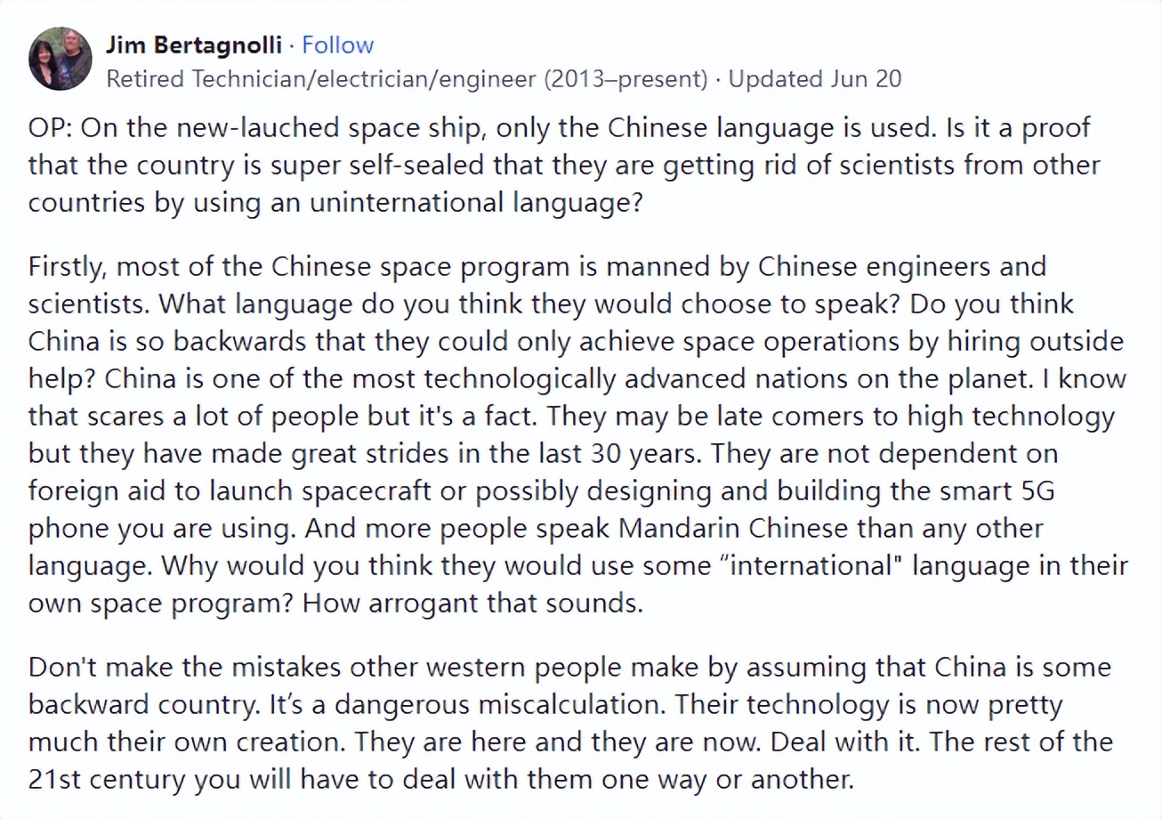 有一位博主在Quora上提问称:在新发射的太空船上只使用中文,这是否说明这个国家超级自我封闭,他们正在通过使用一种非通用语言来摆脱来自其他国家的科学家?没想到的是,在帖文下方的留言板里,回复几乎是一边倒地支持中国!