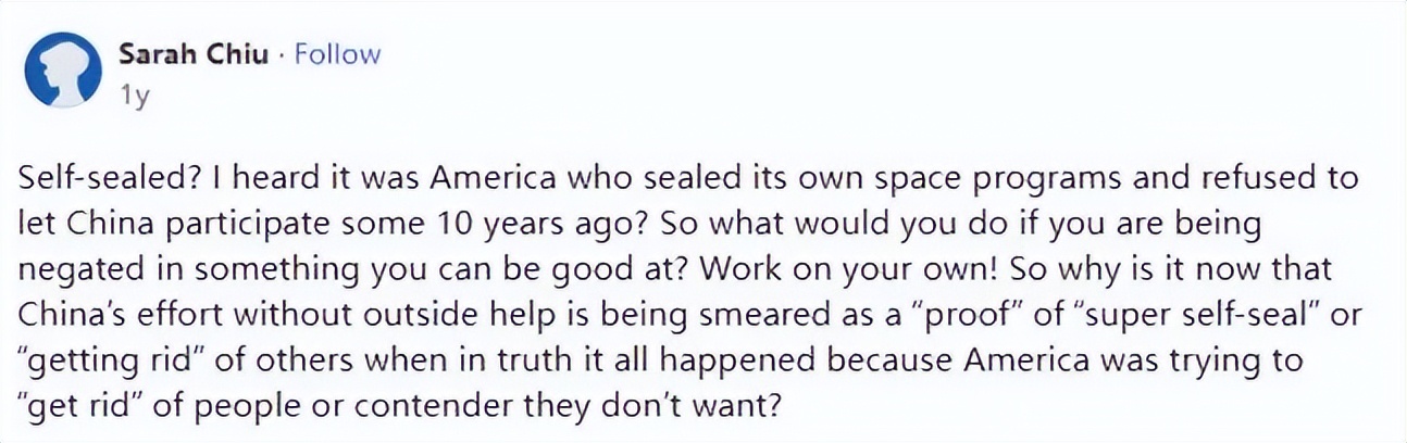 还有一位网友对博主所提到的“自我封闭”提出了反驳:“我听说是美国在10年前封闭了自己的太空计划,并拒绝让中国参与?所以,如果你擅长的事情被否定了,你会怎么做?独立工作!那么,为什么现在中国在没有外界帮助的情况下的努力,被抹黑为‘超级自我封闭’或‘摆脱’他人的“证据”?实际上这一切都是因为美国试图‘摆脱’他们不想要的人或竞争者所造成的。”