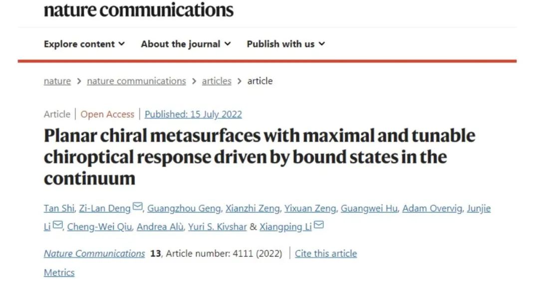 近日,光子技术研究院李向平、邓子岚教授团队在光学超表面研究领域取得重要进展,其最新研究成果以“Planar chiral metasurfaces with maximal and tunable chiroptical response driven by bound states in the continuum”为题,于2022年7月15日发表于《Nature Communications》上。
