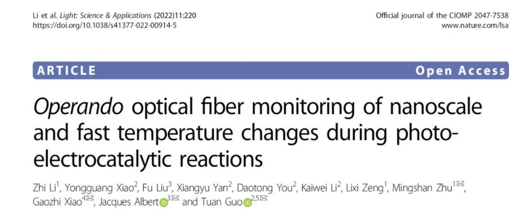 相关研究成果以“Operando optical fiber monitoring of nanoscale and fast temperature changes during photo-electrocatalytic reactions” 为题发表在期刊Light: Science Application(影响因子20.257)。暨南大学李志博士生、萧勇光硕士生、加拿大卡尔顿大学刘甫博士为论文的共同第一作者,论文通讯作者为暨南大学郭团教授和朱明山教授。该工作由暨南大学、加拿大卡尔顿大学、加拿大科学院相关团队合作完成。