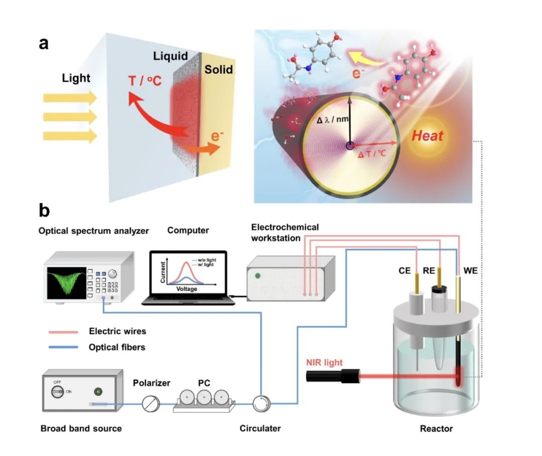 为了攻克这一难题,郭团教授团队与朱明山教授团队合作,提出一种高灵敏度光纤光梳热测量技术,率先实现了对液-固界面催化反应产热过程的纳米尺度、实时、原位、精准测量。该团队研发了一种大角度倾斜光纤光栅,这一细如发丝的光纤传感器即可附着于催化材料表面、也可嵌入其内部。此文,这一光纤传感器还提供了多光谱模式检测功能,用于消除催化过程中环境温度变化对催化界面温度的干扰。该团队在国际上率先实现了光参与的液固催化界面的局域温度的精准测量,为揭示催化和表界面的物理与化学基本规律和开发热监测方式提供了方法支撑。