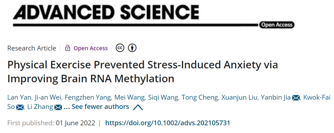 粤港澳中枢神经再生研究院张力课题组在苏国辉院士支持下,于国际权威学术期刊Advanced Science (IF=16.8)发表题为“Physical exercise prevented stress-induced anxiety via improving brain RNA methylation”的研究论文。