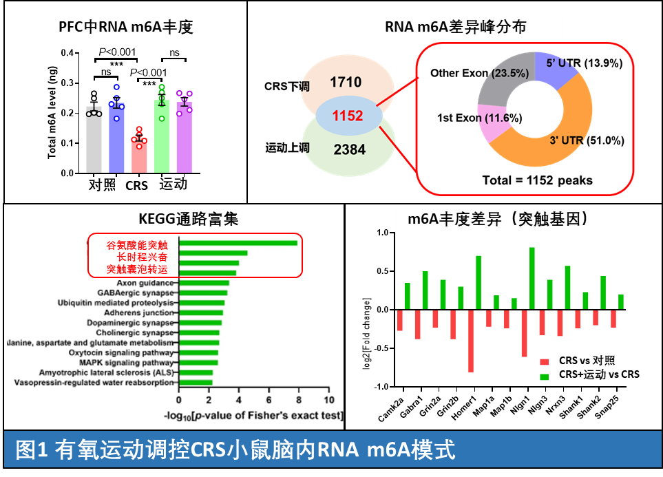 本研究首先建立了慢性束缚压力应激(CRS)小鼠模型以及对前额叶皮质(PFC)进行基于N6-甲基腺苷(m6A)修饰的转录组学测序,通过人为操纵RNA去甲基酶ALKBH5的表达水平,证实了运动预防焦虑样表型发生,依赖于其对脑内m6A水平的改善。