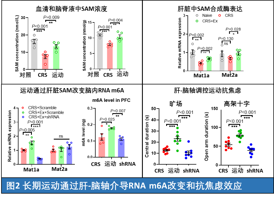 进一步的研究对运动改变脑内RNA m6A的生物学机制进行了解析。进一步通过敲低肝脏中Mat1a基因表达,证实了运动改善脑内RNA m6A及抗焦虑的作用依赖于肝脏内SAM的生物合成(图2)。