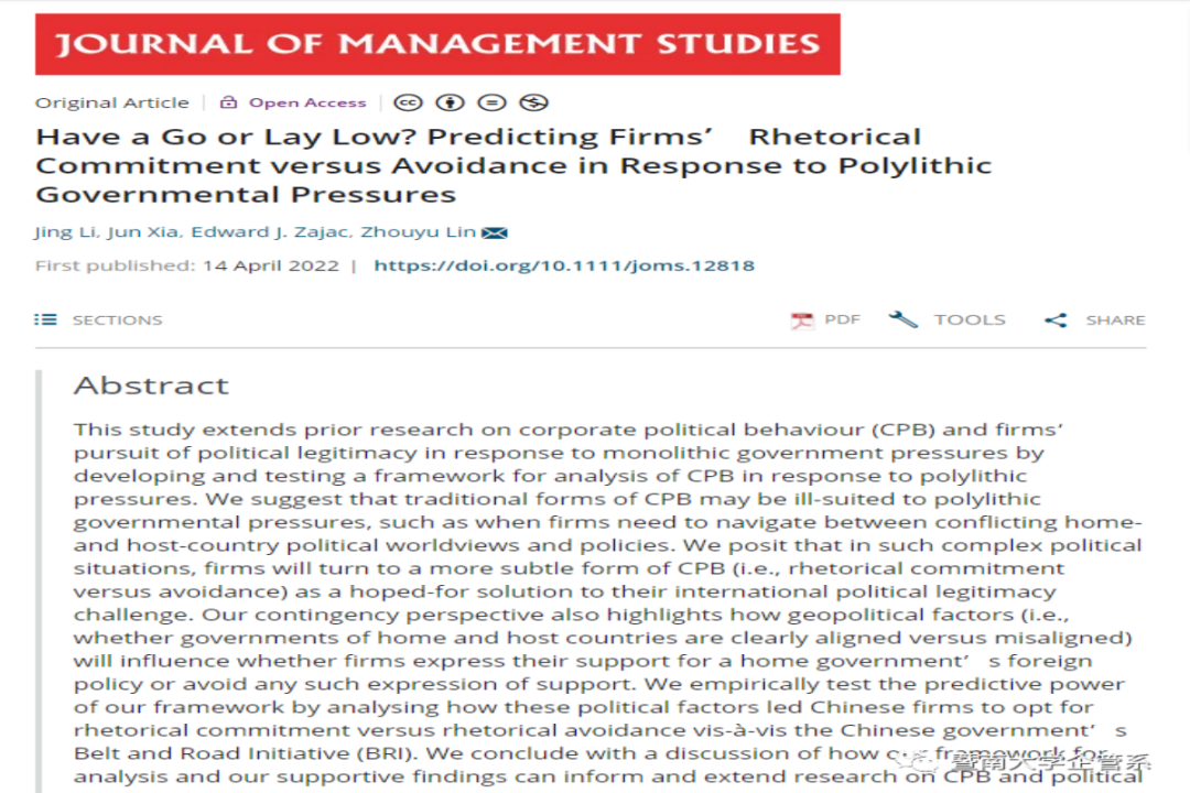 近日,管理学院企业管理系副教授林洲钰作为通讯作者完成的论文“Have a Go or Lay Low? Predicting Firms’ Rhetorical Commitment versus Avoidance in Response to Polylithic Governmental Pressures”在管理学领域的国际权威学术期刊 Journal of Management Studies(FT-50期刊)在线发表。