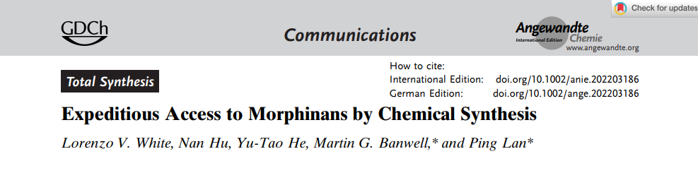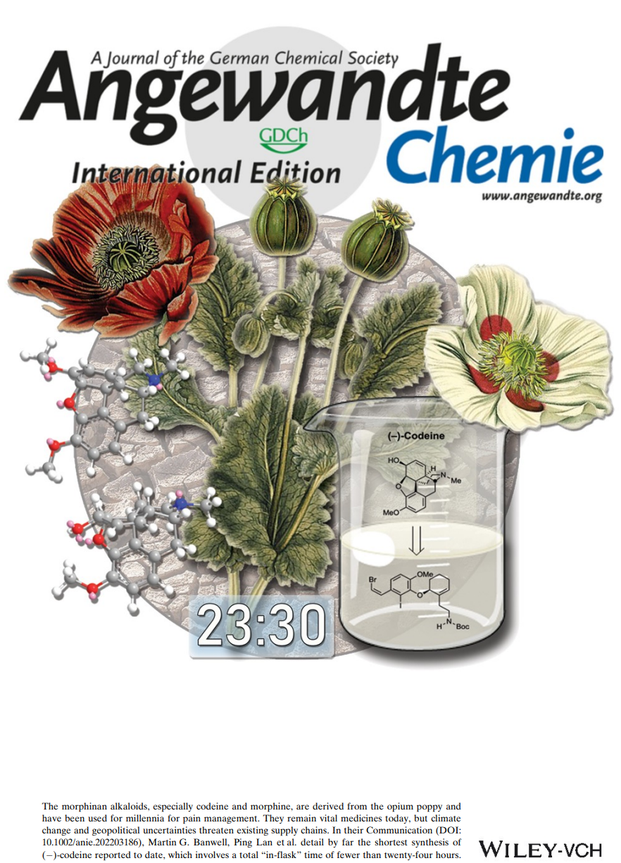 近日,药学院先进与应用化学合成研究院Martin Banwell院士团队在吗啡喃镇痛药全合成领域取得重大进展,以史上最短的制备工艺实现了吗啡喃的快速、高效、简洁合成,研究成果以“Expeditious Access to Morphinans by Chemical Synthesis”为题发表在国际权威学术期刊Angewandte Chemie(影响因子15.336)上,并被选为最新一期的封面论文。