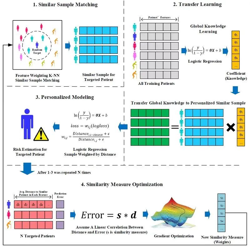 本研究颠覆传统亚组建模,充分证实了本研究的个性化模型相对于目前全局建模和亚组建模的普遍显著优势;提出迁移学习和个性化原创性算法框架PMTL(Personalized Modeling with Transfer Learning),使基于单个医院数据的个性化模型可以匹敌目前所有同类国际领先模型性能;结果个性化模型为临床因素交互作用挖掘提供了极大便利。