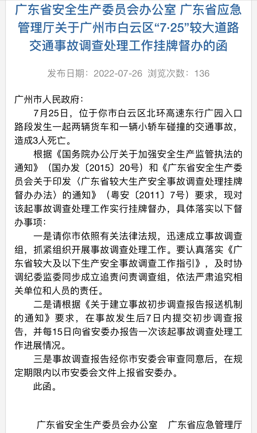 26日,广东省安全生产委员会办公室、广东省应急管理厅发布关于广州市白云区“7·25”较大道路交通事故调查处理工作挂牌督办的函。