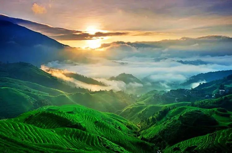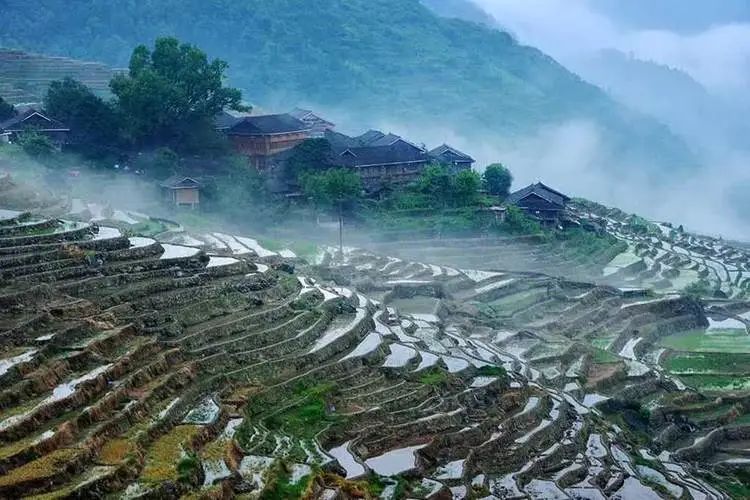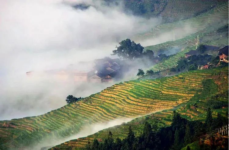 龙胜龙脊梯田,是壮瑶族人民勤劳智慧的结晶,是农民长期的劳动成果,是大地的乐章。云雾弥漫于阁楼梯田间,如镜的梯田中点缀着耕牛、衣着火红的耕者、碧绿的秧苗,宛如一幅气势磅礴的造化写意。