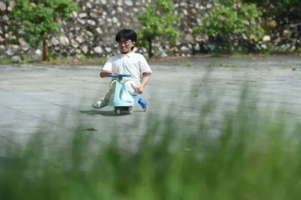 张亮驾着“扭扭车”在校园里 新华社记者 周牧 摄