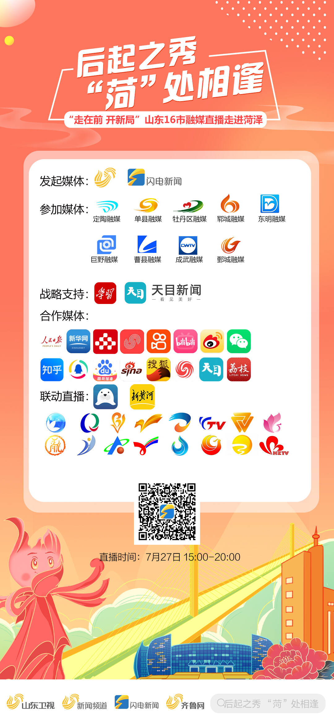 7月27日15时-20时直播第七站走进菏泽,以“印象·菏泽”“出圈·菏泽”“后浪·菏泽”“温度·菏泽”四个篇章,带大家品尝牡丹花宴席,去水浒好汉城体验水浒好汉文化,到拥有500多年历史的古村落探秘、感受峥嵘岁月,到远近闻名的曹县感受淘宝电商的发展史、揭秘比名牌包还要贵的假发,探寻国内最大的青霉素生产公司之一,了解黄河滩区百姓迁建的故事……