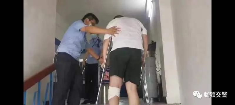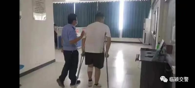 在候考区,考试岗辅警臧金龙发现一位拄拐的考生,立即上前询问情况,得知考生李先生在开考前几天因打篮球造成腿部韧带拉伤,由于已经成功预约科目三安全文明考试,不想缺考,便拄拐参加考试。