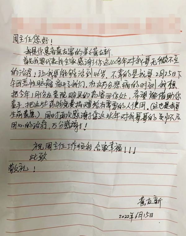 6月中旬,黄友新将这些药物打包了整整一箱,寄到武汉亚洲心脏病医院。他把哥哥离世的消息告诉周红梅主任,并表示:“希望能借助你贵手,把这些药物免费捐赠给有需要的人使用,这也是我哥生前遗愿。”