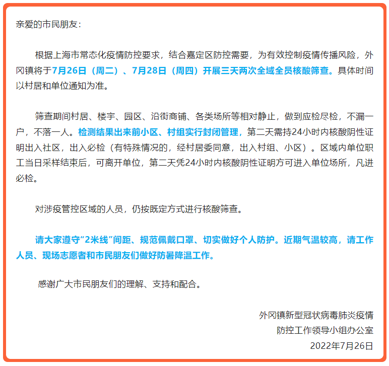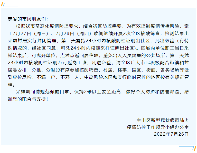 昨天深夜宝山发布最新告居民书▼7月27日(周三)、7月28日(周四)晚间继续开展2次全区核酸筛查检测结果出来前村居实行封闭管理第二天需持24小时内核酸阴性证明出社区