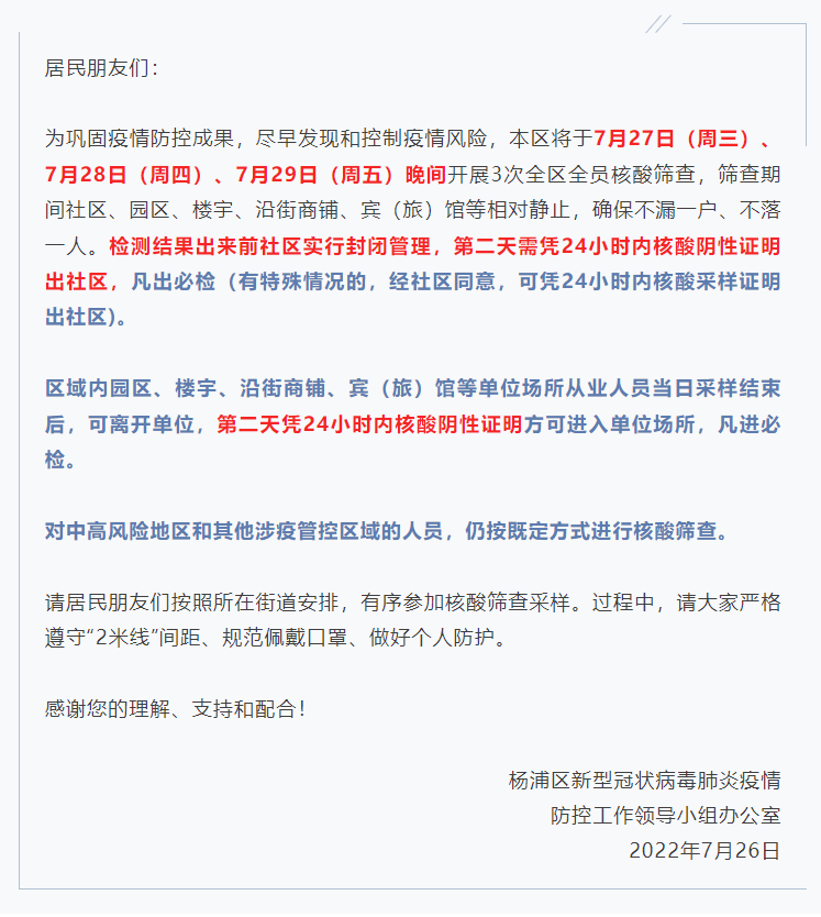 杨浦也发布告居民书▼7月27日(周三)、7月28日(周四)7月29日(周五)晚间开展3次全区全员核酸筛查检测结果出来前社区实行封闭管理第二天需凭24小时内核酸阴性证明出社区