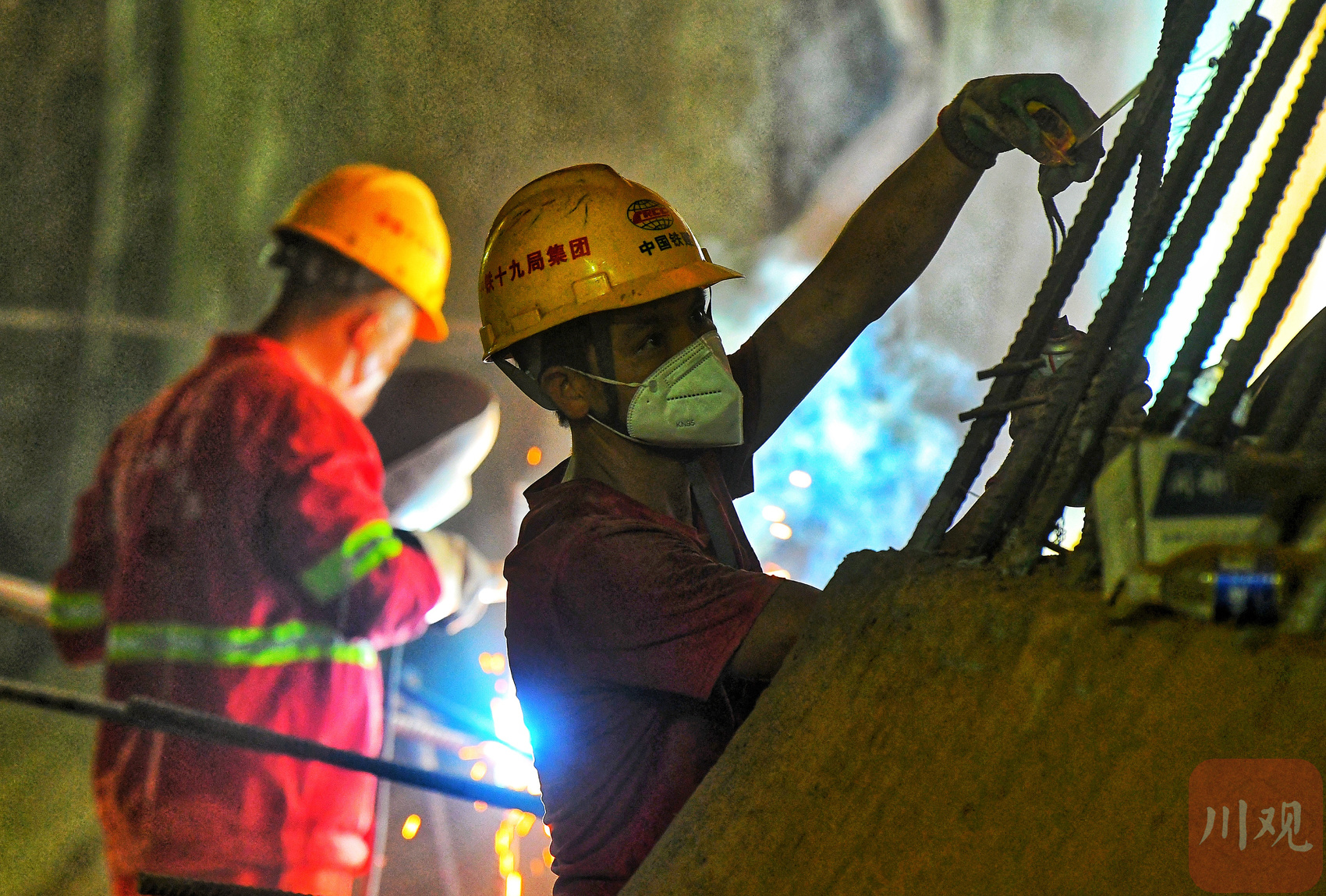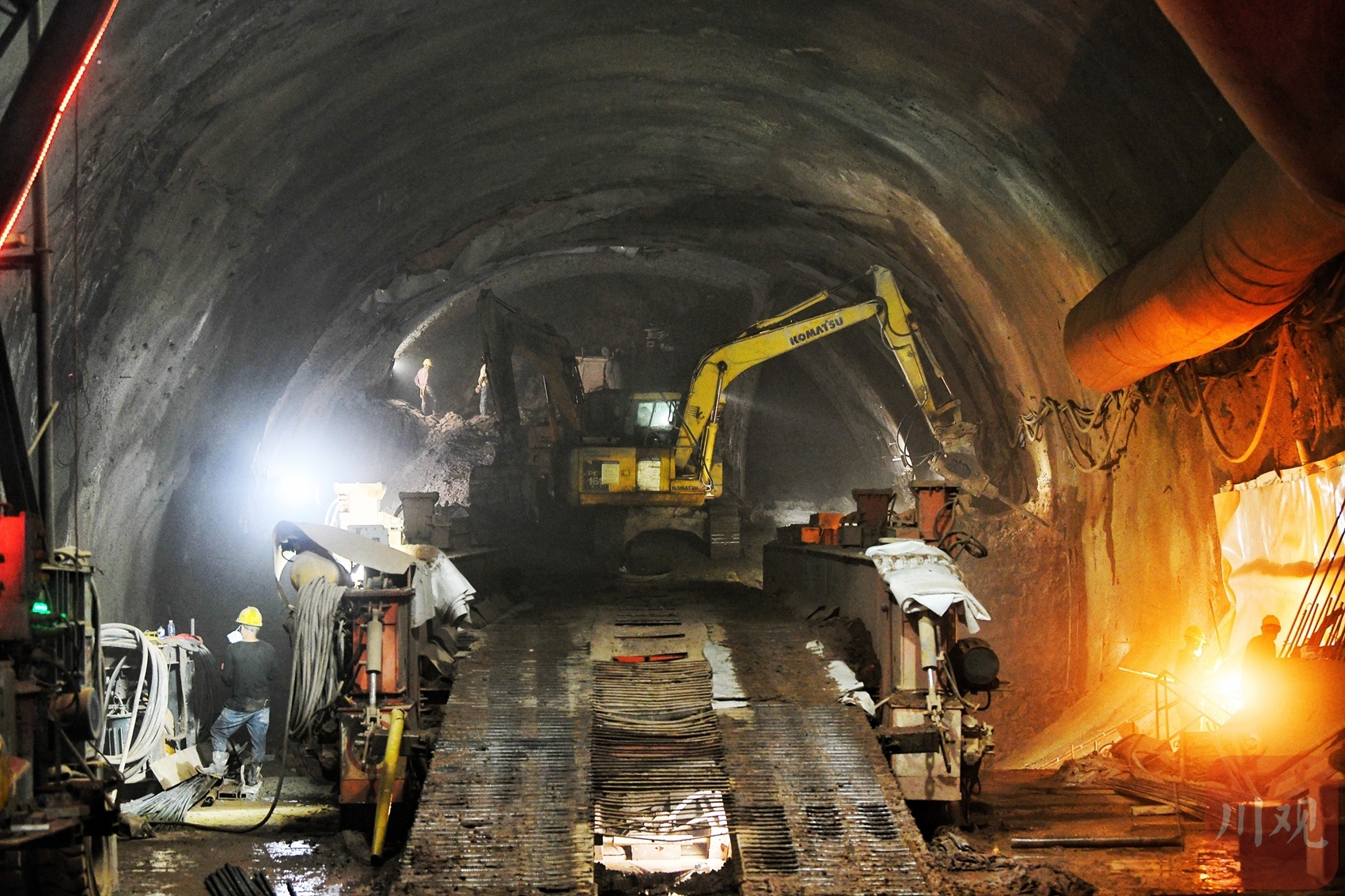 第一层“台阶”与第二层“台阶”的交接处,火光四溅,几名工人熟练地将型钢定位、连接。刘保宝查看进度后,和洞外通话:“仰拱这里,来钢筋!”他告诉川观新闻记者,这里在进行仰拱的初期支护作业,初步定型后,接下来要用钢筋进行绑扎固定,“先把钢筋送进来放在旁边候着,等这道工序完了,马上就可用上,不用等。”20多分钟后,一台挖掘机挂着一捆钢筋送到仰拱作业点,刚取下来没多久,就被拆捆用起来了。