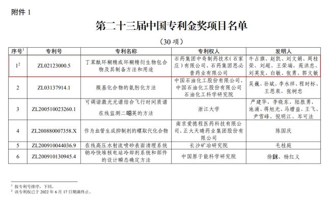 根据《中国专利奖评奖办法》规定,经国务院有关部门知识产权工作管理机构、地方知识产权局、有关全国性行业协会,以及中国科学院院士和中国工程院院士等推荐,中国专利奖评审委员会评审,社会公示,国家知识产权局和世界知识产权组织决定授予“丁苯酞环糊精或环糊精衍生物包合物及其制备方法和用途”等30项发明、实用新型专利中国专利金奖,“伽马刀”等10项外观设计专利中国外观设计金奖;