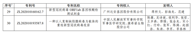 其中,发明人为陈薇等,专利权人为中国人民解放军军事科学院军事医学研究院、康希诺生物股份公司的“一种以人复制缺陷腺病毒为载体的重组新型冠状病毒疫苗”(ZL202010193587.8)荣获第二十三届中国专利金奖。
