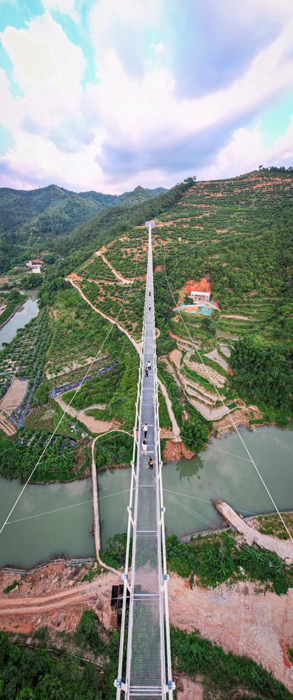 站在520米长的钢格栅索桥中间,距离地面已有131.4米,脚下的河水犹如一条碧绿的带子,蜿蜒缠绵。放眼远处,群山峦叠,云缠雾绕,一幅秀丽的山水油画展现在眼前。这是记者在走访三华李度假区信宜520索桥看到的景象,景区以“李”为媒打造度假胜地。