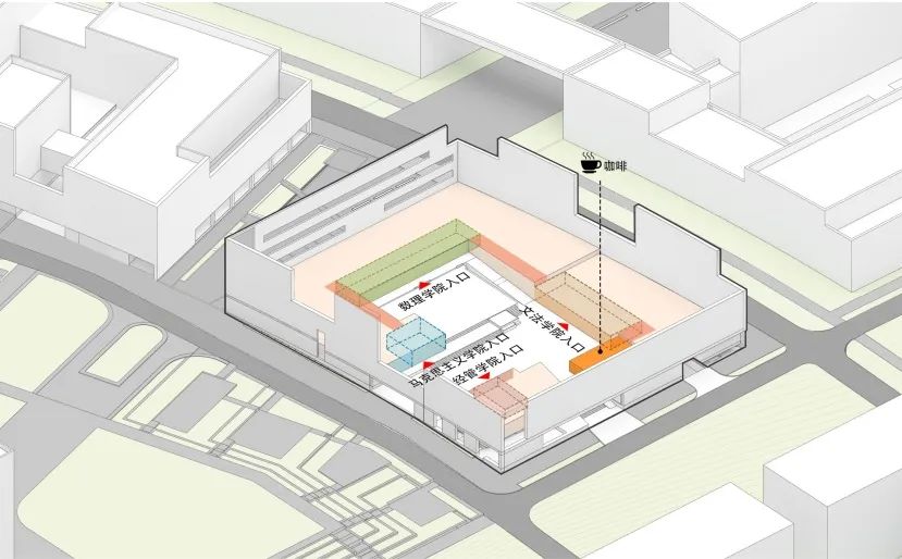 为全面契合“入主流、有特色、倡交叉”的“新文科”建设理念,实现在同一单体建筑中满足马克思主义学院、经管学院、数理学院、文法学院等4个学院不同学科教学科研需求,文科楼采用了错层堆叠结构和围合式庭院设计,充分考虑使用和管理需求,精心打造相对独立、界面清晰、各具特色的学院功能区域。各学院均设有独立入口,通过首层门厅、围合院落和二层平台、回廊等共享交流空间相互融通,助力学科深度交叉融合创新。