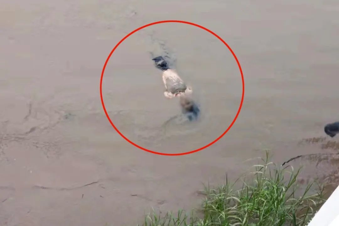 男孩身体几乎被江水淹没