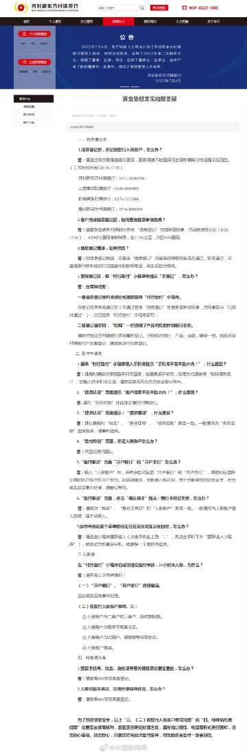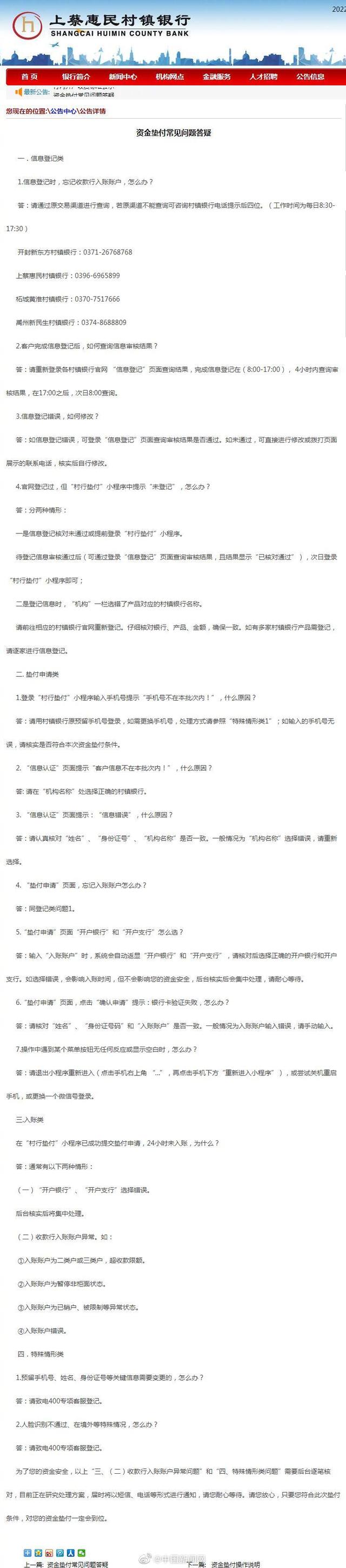 河南禹州新民生村镇银行、上蔡惠民村镇银行、柘城黄淮村镇银行、开封新东方村镇银行7月27日、28日两天在官网发布资金垫付常见问题答疑公告,对信息登记类、垫付申请类、入账类及特殊情形类问题进行答疑。注意到,四家村镇银行均在公告中表示,只要符合此次垫付条件,资金垫付一定会到位。