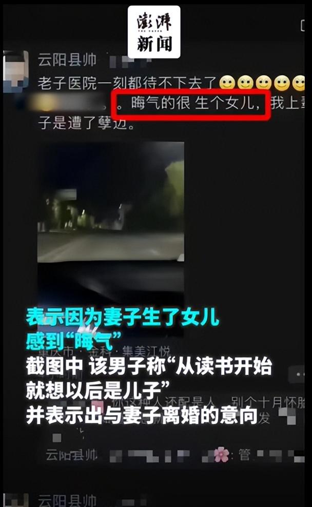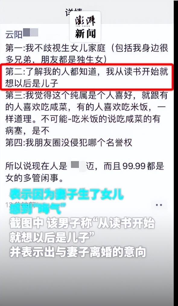 7月26日,有网友发文称,重庆市云阳县一男子称“生女儿晦气,名字都懒得取”。从网友晒出的男子朋友圈截图可以看到,男子发文称:“在医院一刻都待不下去了,晦气得很,生个女儿”“期待十个月,期待这么一个,真是倒霉。为什么老天对我这么不公”……甚至还有网友晒出了男子称要和妻子离婚的朋友圈截图。