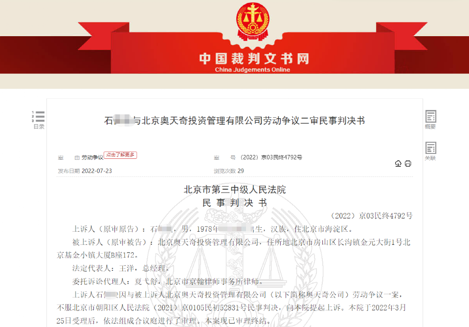 近日,中国裁判文书网公布的一份民事判决书,揭示了某资深私募从业者石某某与前东家奥天奇对簿公堂的详情。在“帮助”公司拿下私募基金牌照后,石某某在短短三个多月的时间便被“单方违法解除劳动合同”。