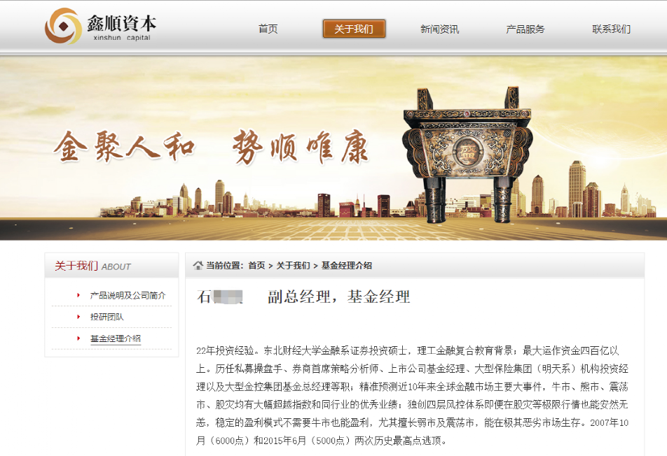 在公开出席某投资策略会时,石某某的个人简介为:东北财经大学金融学专业硕士,曾任职银泰证券首席策略分析师、北京东方盛景投资咨询有限公司创始人及证券投资总监、东方集团股票投资经理、明天控股集团机构投资经理、重庆民商投资控股集团基金公司副总经理、北京中投元邦基金经理。