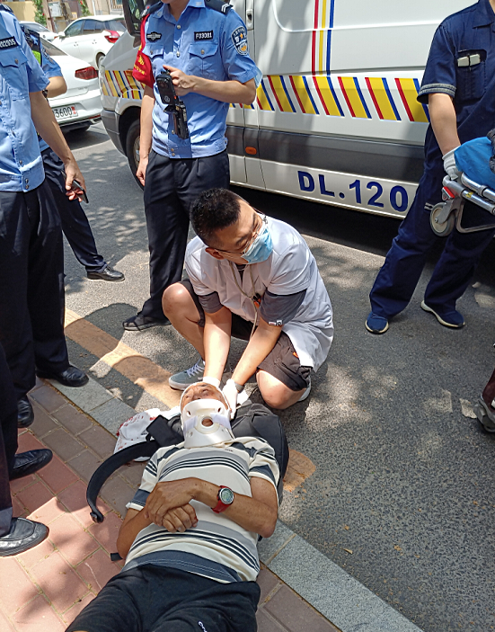 "大夫,下边路口有位老人跌倒了,脑袋磕道边了,一直在流血,能不能帮忙去看看啊?" 7 月 27 日中午,有市民跑到中山区海军广场街道社区卫生服务中心求救,三位医护人员急忙赶到事发现场,对受伤老人进行紧急处置,后经了解,这位老人 82 岁,因为抢救及时,幸无生命危险。事后还有个小插曲,许昌剑医师返回诊室后,才发现自己膝盖多处擦伤。
