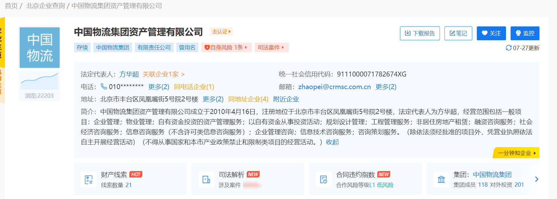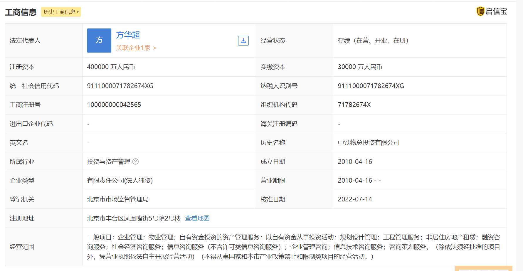 启信宝显示,中国物流集团资产管理有限公司,注册资本为40亿元,经营范围包括一般项目:企业管理;物业管理;自有资金投资的资产管理服务;以自有资金从事投资活动;规划设计管理;工程管理服务;非居住房地产租赁;融资咨询服务;社会经济咨询服务等。