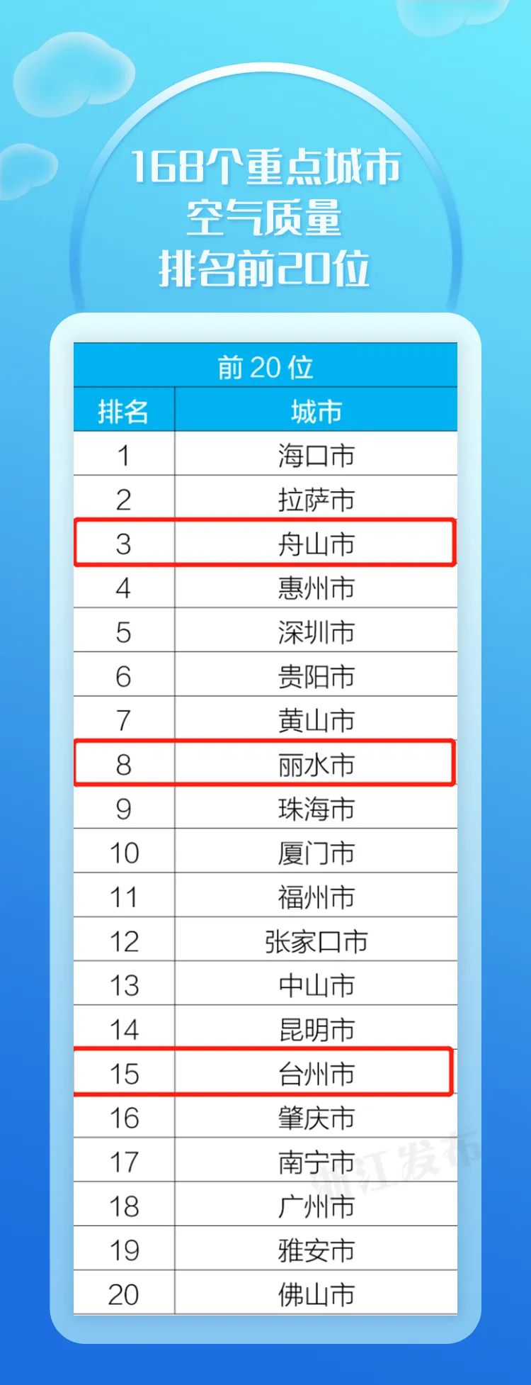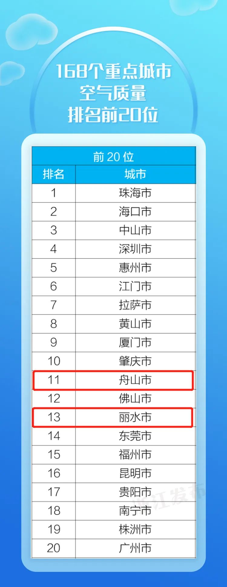 168个重点城市空气质量排名前20位中,浙江有2座城市上榜,分别是:舟山市、丽水市。