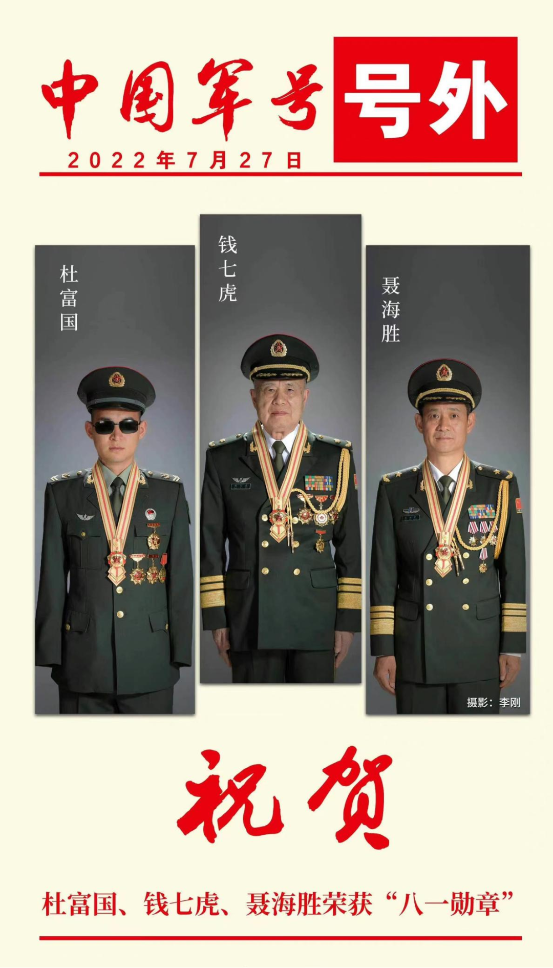 忠诚使命、英勇无畏的排雷英雄杜富国,科技强军、为国铸盾的防护工程专家钱七虎,以及矢志报国、三巡太空的英雄航天员聂海胜,获得八一勋章。他们当之无愧,向英雄致敬!