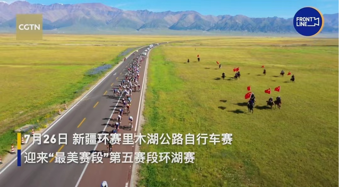 7月26日,新疆环赛里木湖公路自行车赛,牧民策马擎五星红旗为选手助阵加油。画面太震撼,看得人热血沸腾!