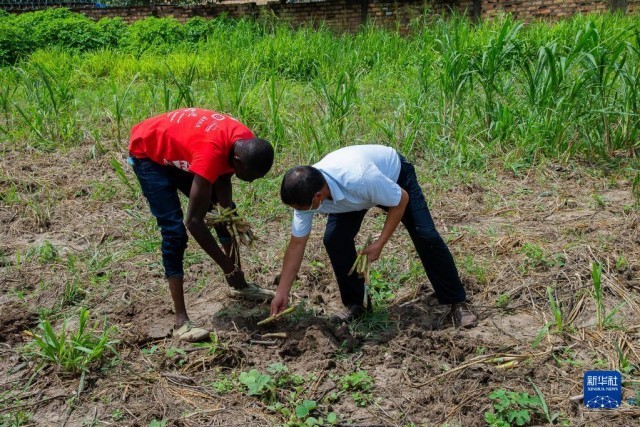 6月1日,在中非共和国首都班吉郊区,当地民众种植菌草。新华社记者 罗毓 摄