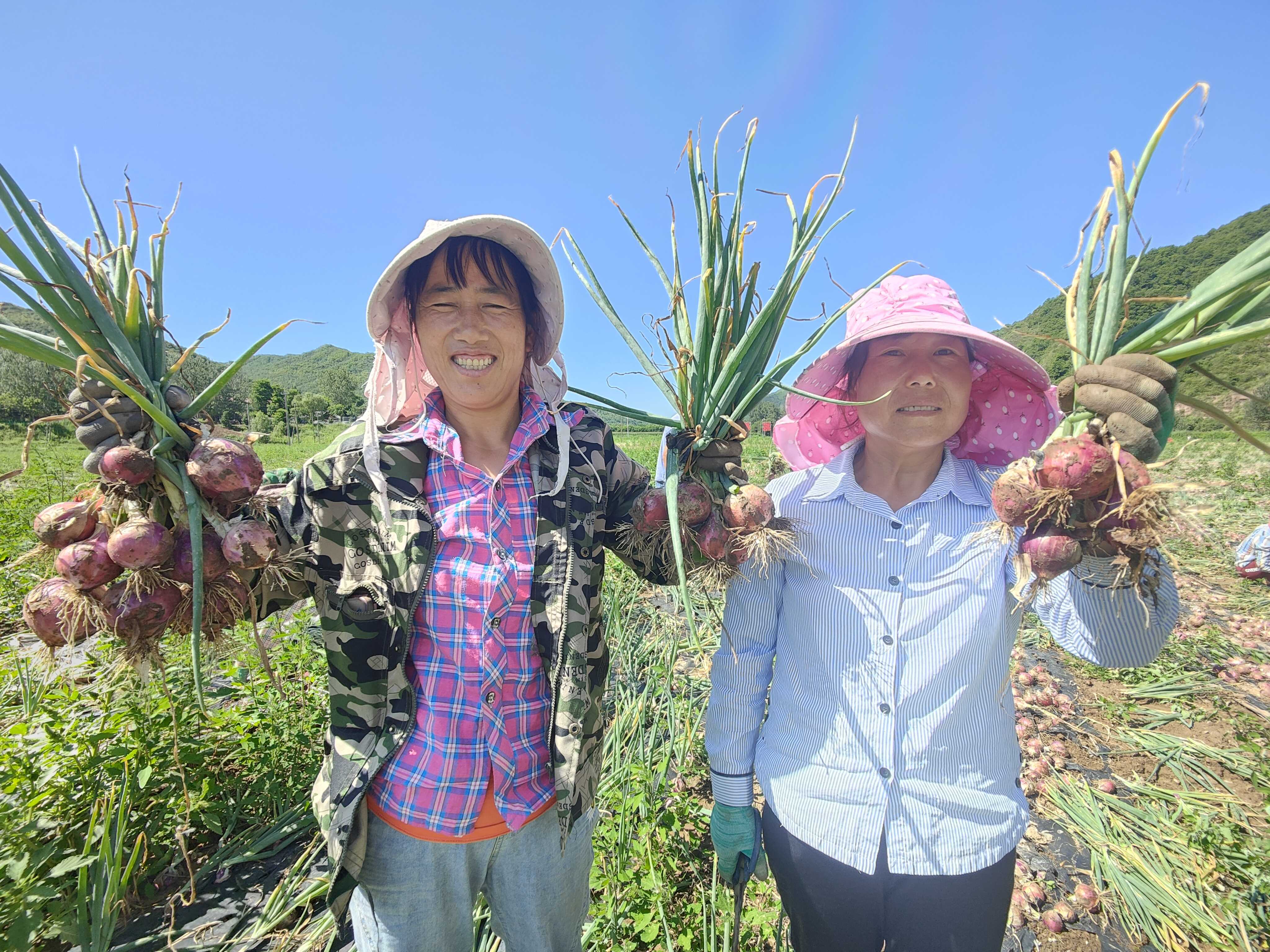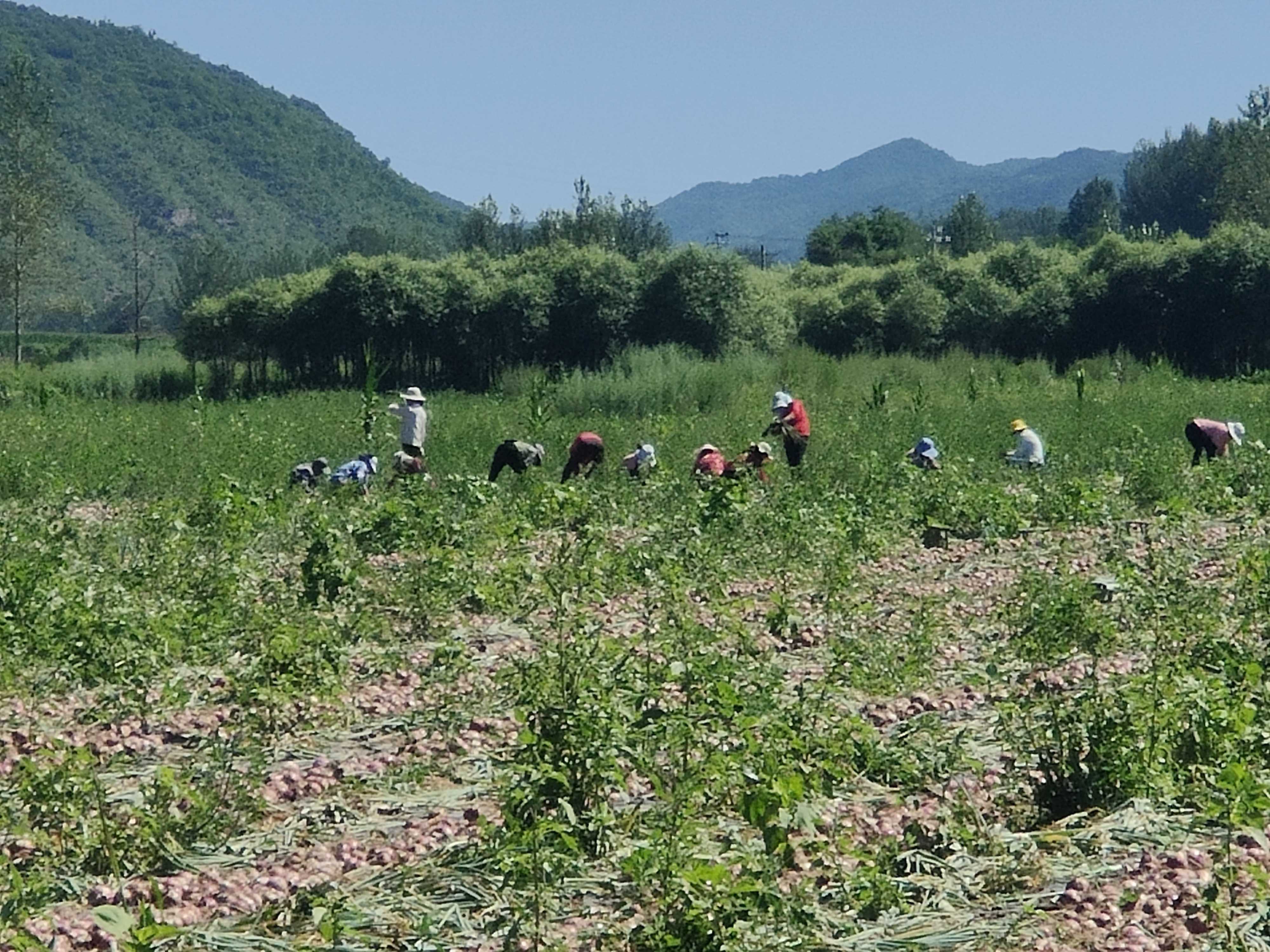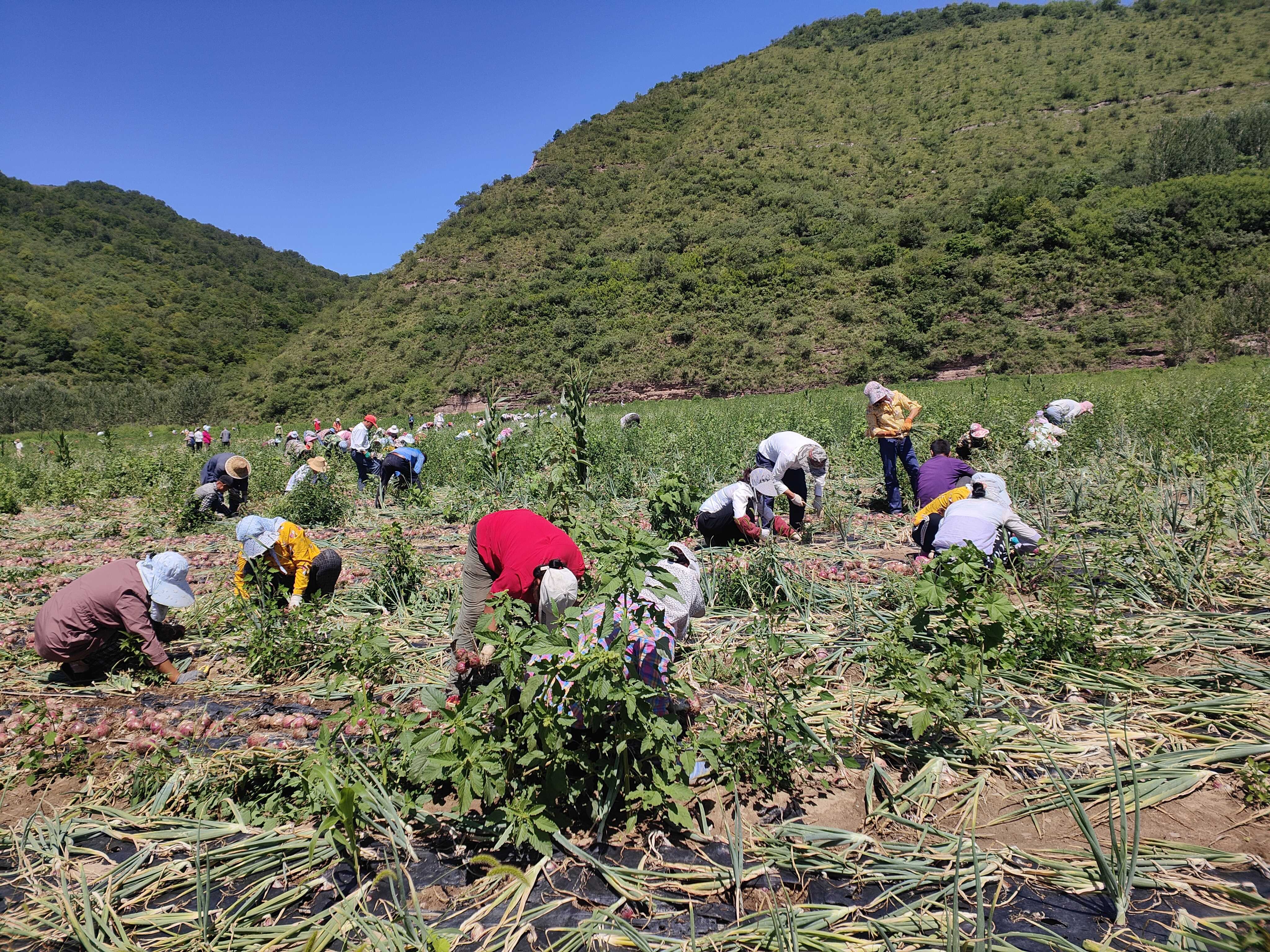 当前洋葱进入了丰收期,几百名工人在基地采收、搬运洋葱,大家紧张而有序地忙碌着。同样沉浸在喜悦中的,还有在家门口赚起外快的农户们。