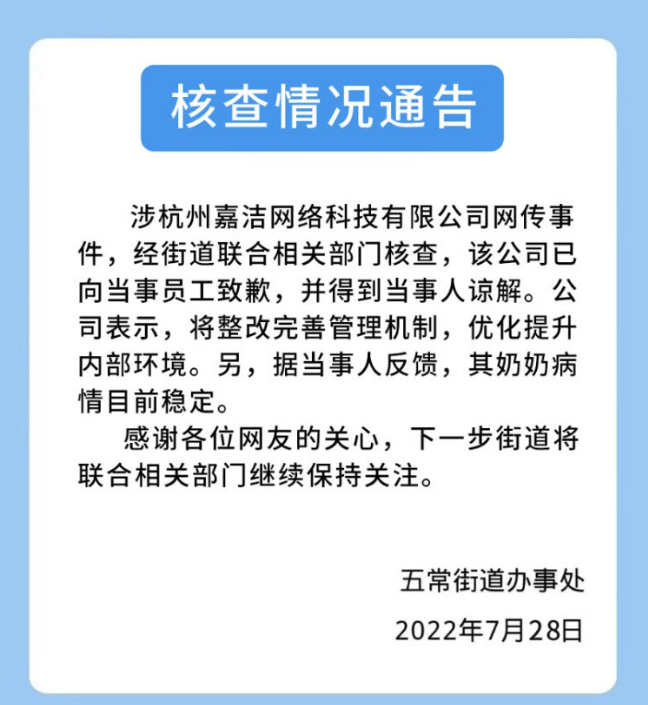 7月28日,五常街道办事处发布了核查情况通告:经街道联合相关部门核查,该公司已向当事员工致歉,并得到当事人谅解。公司表示,将整改完善管理机制,优化提升内部环境。另据当事人反馈,其奶奶病情目前稳定。