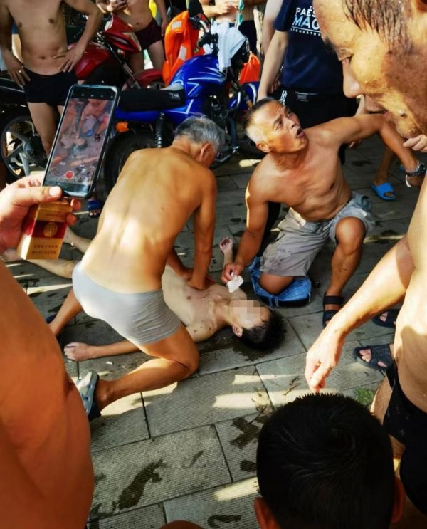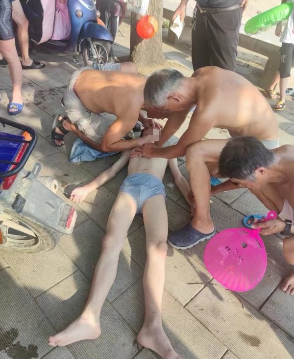 7月27日16时56分,在武汉市新洲区举水河的邾城游泳协会游泳基地,周围人群都在戏水纳凉时,一声“有人会心肺复苏吗?”打破了宁静,当时在一旁休息的余红路等游泳队员立马上前查看。