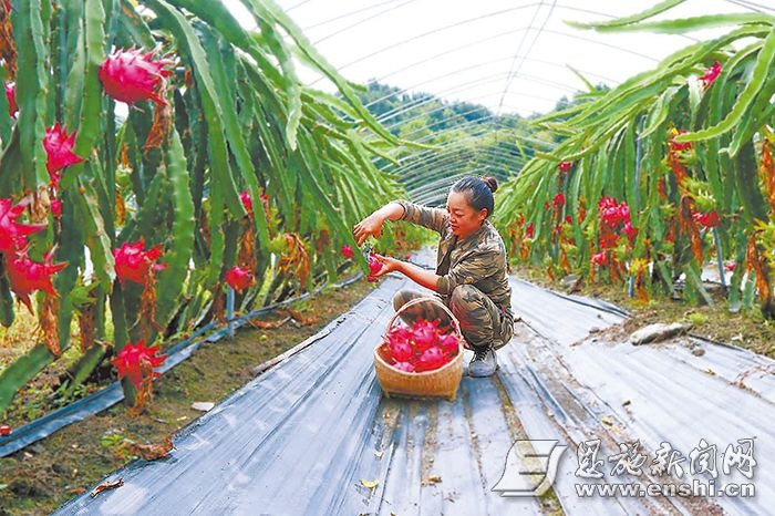 7月27日,建始县长梁镇桂花村种植大户万惠英正在采收成熟的火龙果。