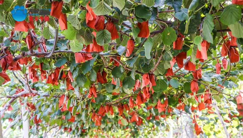 在猕猴桃种植区,塑料大棚里,藤蔓上猕猴桃被红色纸袋严密包裹着,它们正在大口大口吸收养分,正静静地生长,酝酿果汁。