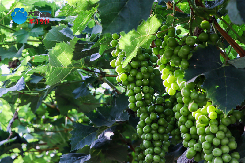 7月13日,酷暑难耐,在新天源猕猴桃种植基地阳光玫瑰葡萄园区,大串大串的绿色葡萄长势喜人。