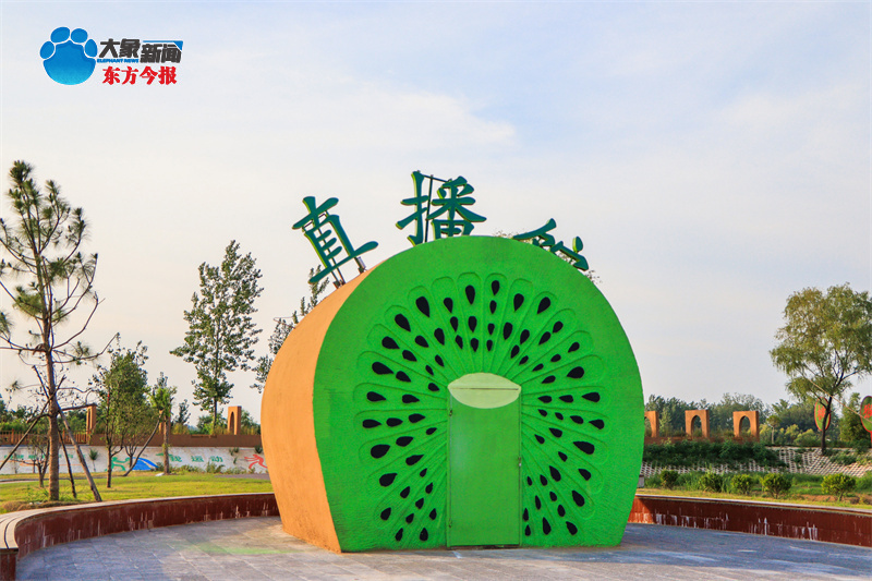 在新天源猕猴桃种植基地附近的一个广场上,草庙集乡打造了一个猕猴桃广场,广场上有猕猴桃造型的展示馆和直播馆。李鋆表示,下一步,会把这个广场作为农特产品直播带货基地,让电商带动产业发展。