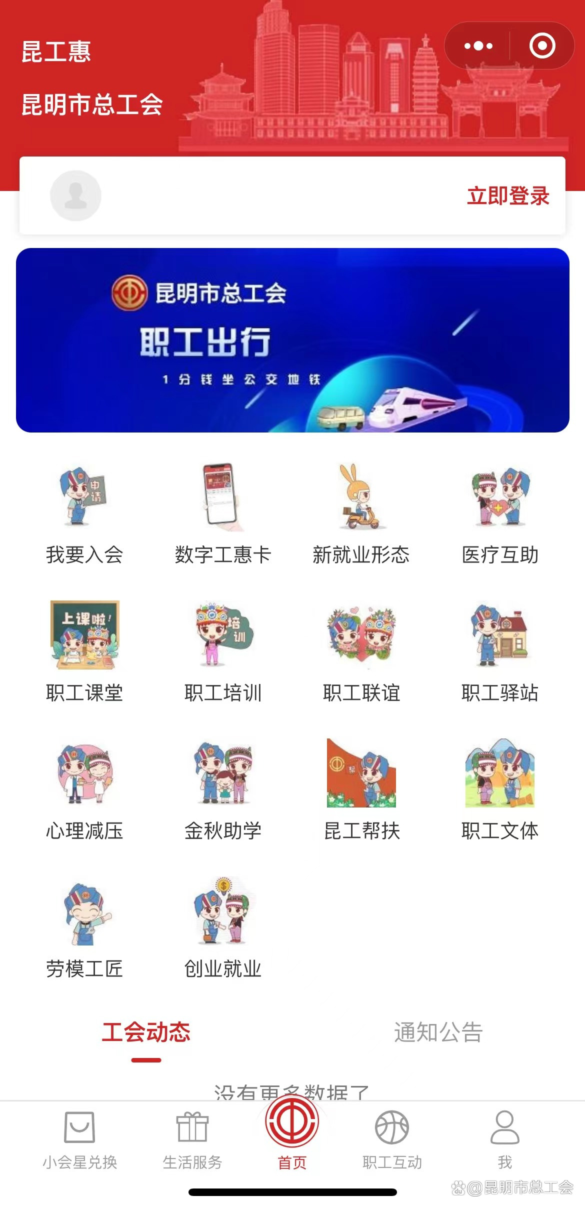 目前,数字工惠卡的服务功能只要是通过“昆工惠”小程序来实现。“昆工惠”小程序功能丰富多样,在小程序上登记了工惠卡信息,就可以享受各种优惠活动和普惠服务。有医疗互助、职工课堂、职工培训、职工联谊、职工驿站、心理减压、金秋助学、昆工帮扶、职工文体、劳模工匠和创业就业等模块。值得一提的是,“昆工惠”小程序中新就业形态模块,其中有农民工工作法律咨询、智送清凉以及体检服务,把“娘家人”对职工和新就业形态劳动者的关怀送到职工手上,温暖送进职工心里。在生活服务这一界面还能领取各种优惠,例如一分钱乘公交,地铁以及购物消费优惠券等。除了普惠服务之外,小程序还设有职工互动窗口和积分兑换活动,更多功能,还等大家来解锁和体验!
