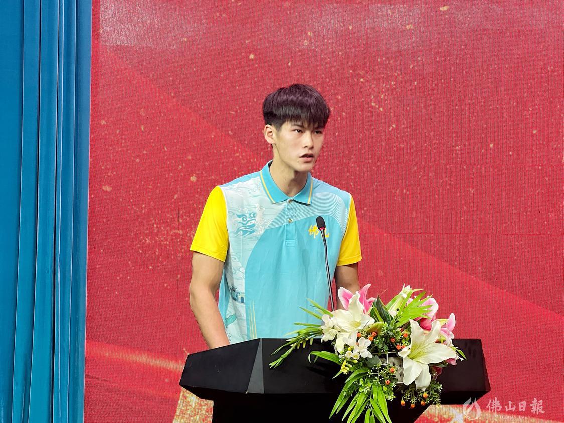 省运会佛山市代表团团长、副市长周紫霄向代表团副团长、佛山市文广旅体局副局长张远征授代表团团旗。