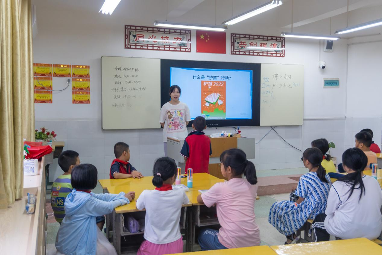 “同学们,我们今天要上一堂特殊的手工制作课——手绘绿书签......”来自华中师范大学的彩虹行动志愿服务队的志愿者们与孩子们一起上了一堂意义非凡的课堂。课堂上,老师通过播放“护苗•网络安全系列课堂”短片,向孩子们讲解了“扫黄打非”的相关知识,引导孩子们积极参与课外绿色阅读、自觉抵制有害出版物和信息,引导他们预防网络沉迷,养成健康向上的学习生活习惯。随后,孩子们用一双双巧手绘制了色彩丰富、生动形象的绿书签,依次分享了自己制作和绘制的绿书签。