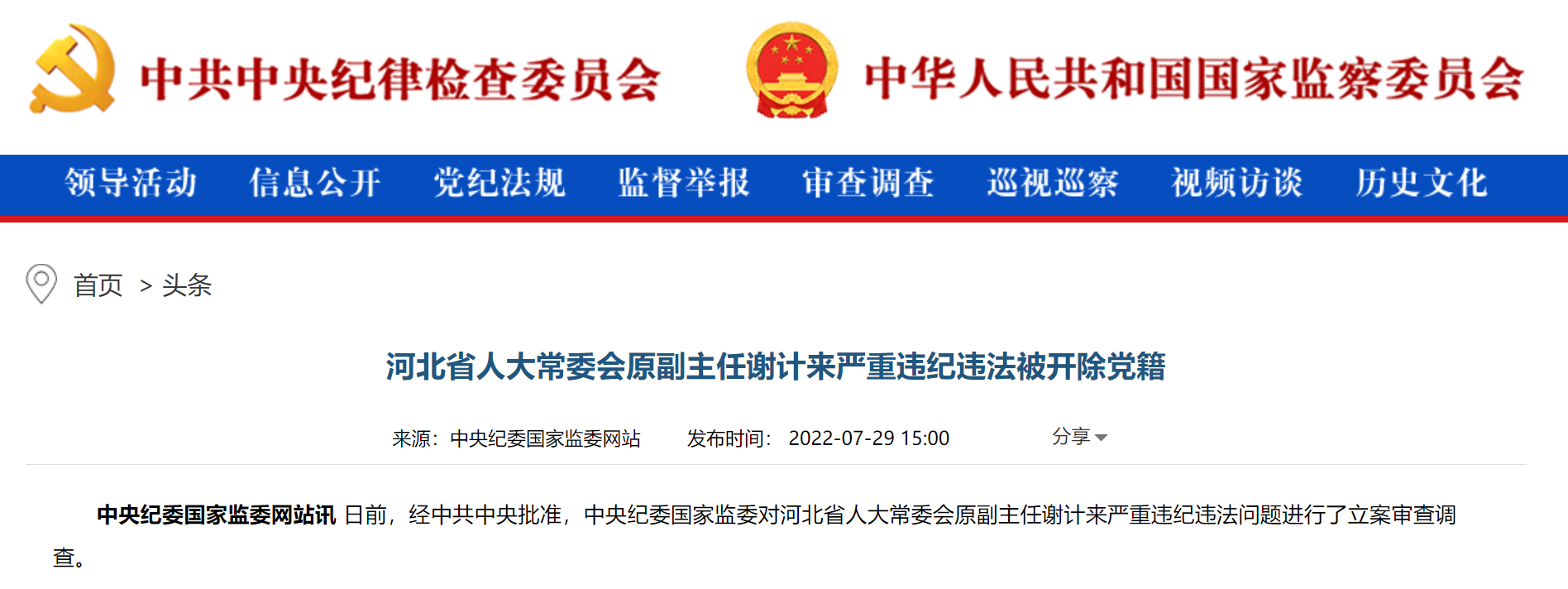 中央纪委国家监委网站今日消息,日前,经中共中央批准,中央纪委国家监委对河北省人大常委会原副主任谢计来严重违纪违法问题进行了立案审查调查。