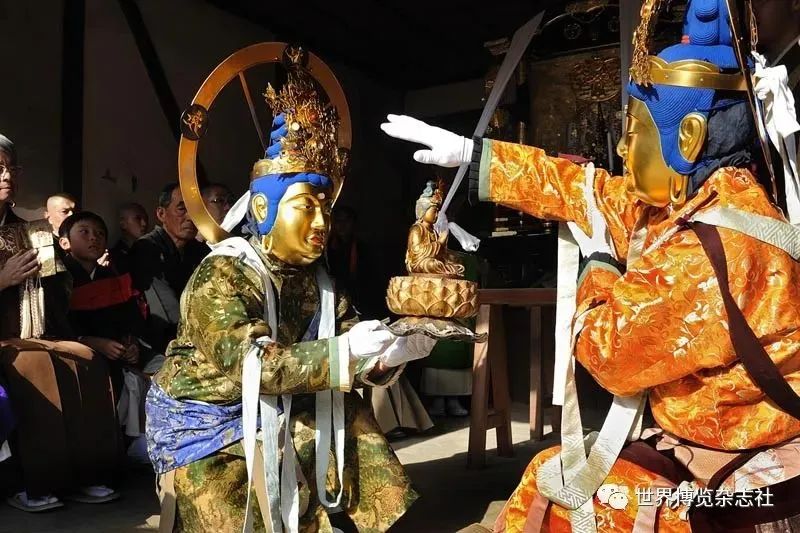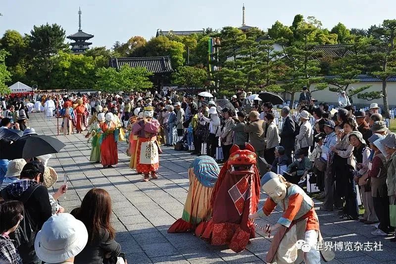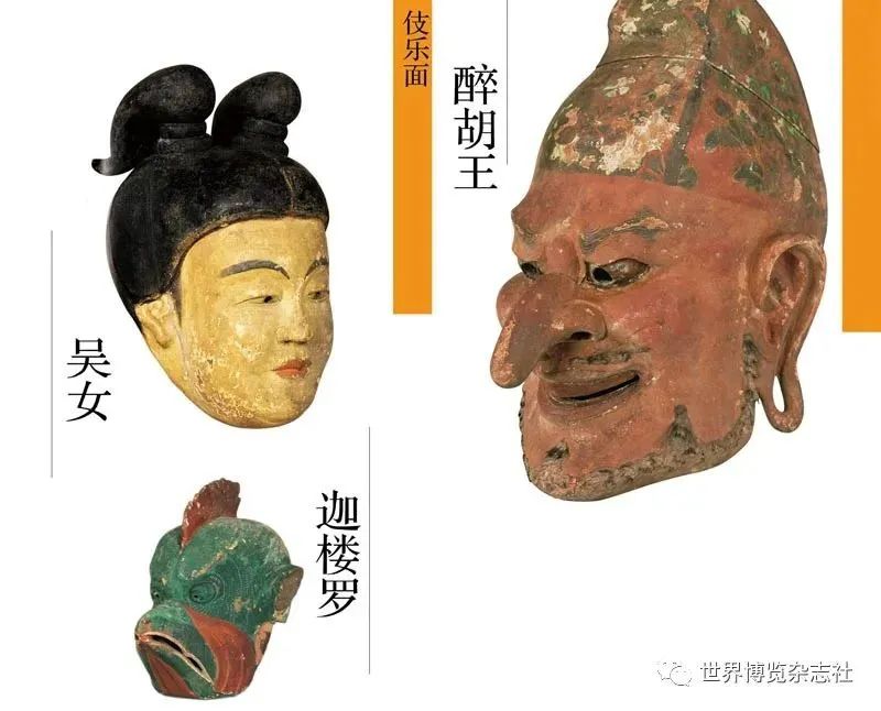 公元612年,朝鲜的味摩之将伎乐传入日本,圣德太子规定伎乐为佛教祭仪,设立乐户,以传习流布。伎乐是一种游行、移动的假面舞蹈,表演者在音乐中列队行进,演戏谑滑稽的小戏,颇似中国乡间的闹花灯、扭秧歌游行。1000多年前的伎乐面具,在日本奈良正仓院、东京国立博物馆、东大寺各处犹存200多具。20世纪30年代,傅芸子考察正仓院时,感其“状貌情态,无不深刻生动”。