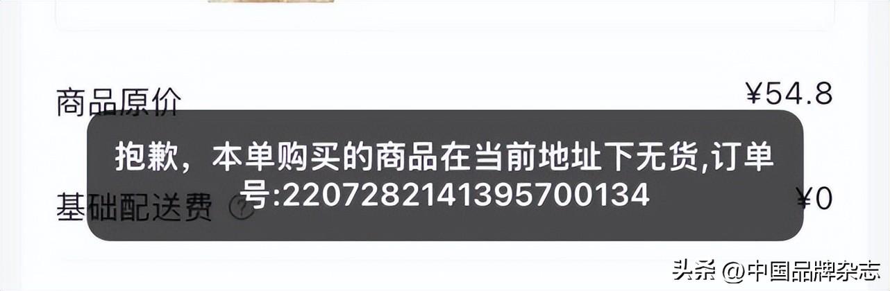记者对购物车选中的产品进行下单时,界面显示“抱歉,本单购买的商品在当前地址下无货”。